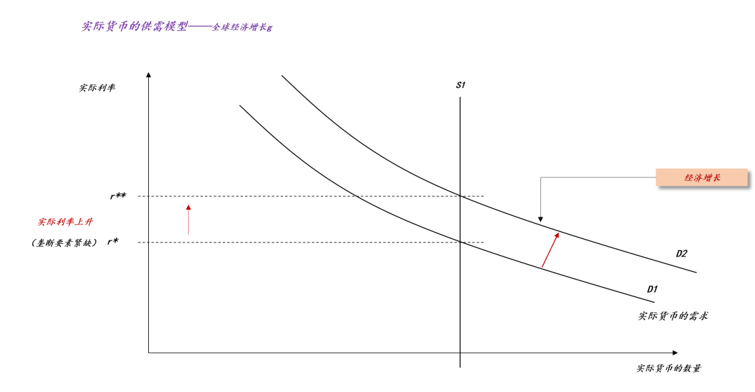 如上图所示,全球经济增长g会导致实际货币需求扩张,从D1扩张到D2,假设实际货币的供给S保持不变,于是,实际利率从r*提高到r**。这段推理告诉我们,实际货币的供需曲线能够很轻松地处理“经济增长的场景”。