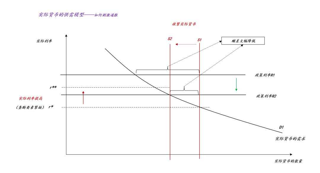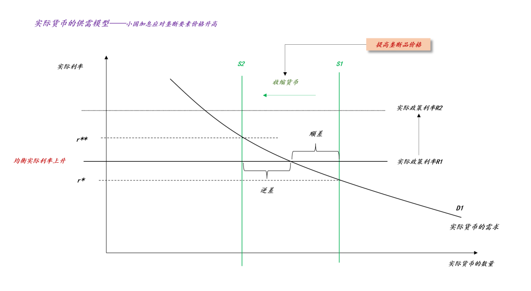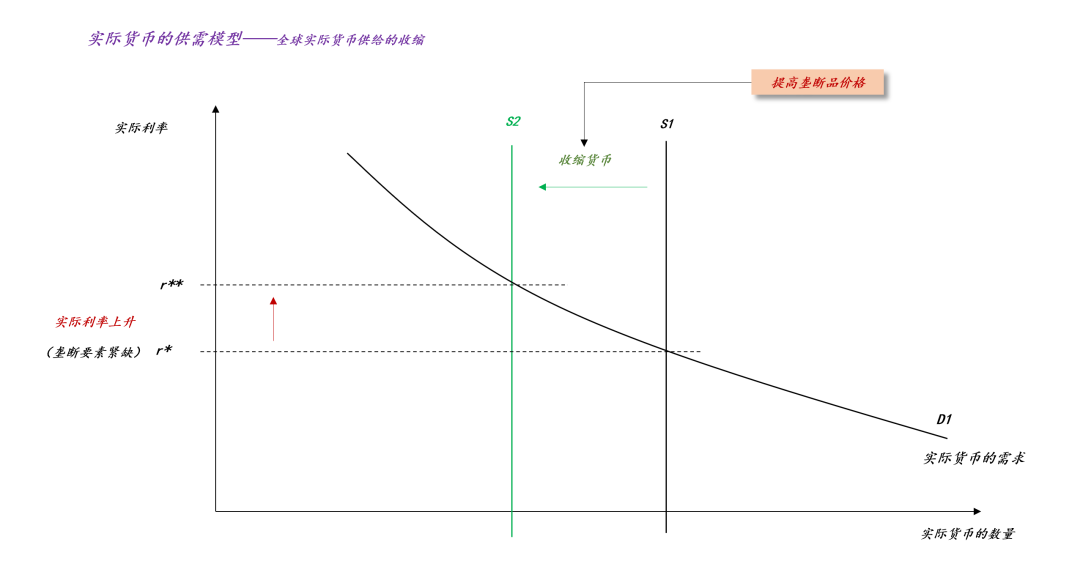 如上图所示,地缘政治的扰动收紧了垄断要素的供应,实际货币量供应量从S1收缩至S2,于是,实际利率从r*升到r**。