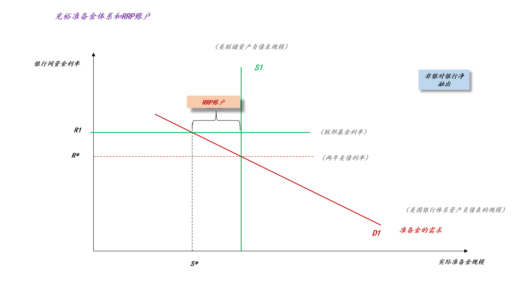 美国所采用的体系是充裕准备金体系。如上图所示,两年美债利率小于联邦基金利率,系统依靠RRP账户配平。也就是说,RRP账户余额越大,两年美债利率对联邦基金利率的正偏离越大。