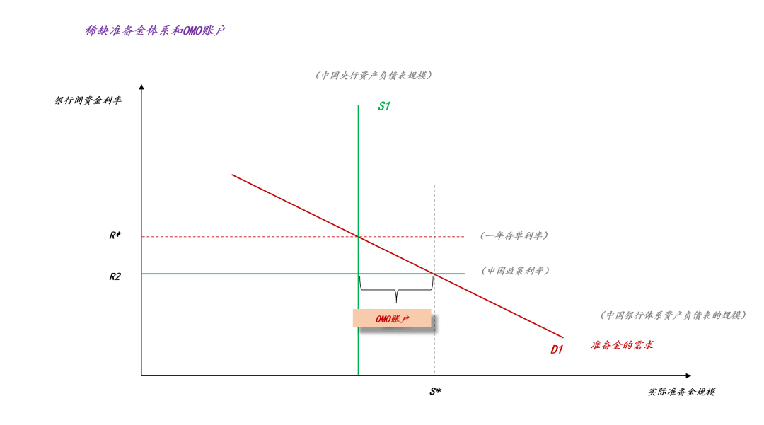 中国所采用的体系是稀缺准备金体系。如上图所示,一年存单利率大于OMO利率,系统依靠OMO账户配平。也就是说,OMO账户余额越大,一年存单利率利率对OMO利率的正偏离越大。