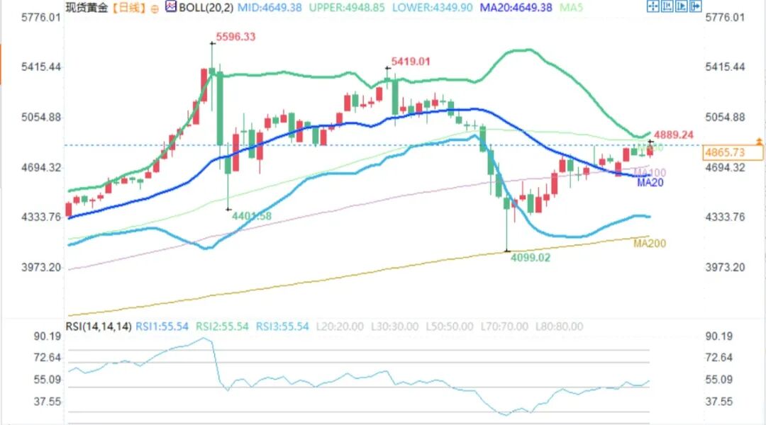 下方支撑位:第一支撑为布林带中轨/20日均线约4649美元,同时100日均线约4713美元已成为回调的关键防守位。